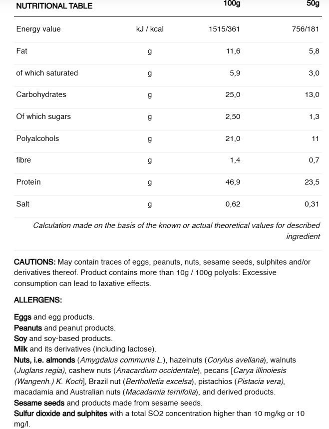 INGREDIENTE: Proteine din lapte (proteine din lapte, emulgator: lecitine (soia)), umectant: xilitol, invelis de ciocolata cu lapte cu indulcitor de cacao: minim 36% (indulcitor: maltitol, unt de cacao, masa de cacao, lapte praf, lapte praf degresat, emulgator: lecitine (soia), aroma) (18,8%), bovine peptide de colagen, sirop de peptide de colagen bovin (peptide de colagen bovin, apă, regulator de aciditate: acid citric), izolat de proteine din soia, ulei de floarea soarelui, nuggets de cacao soia, (izolat de proteine din soia, cacao, amidon de tapioca), arome, sare de mare, emulgator: lecitine (soia).