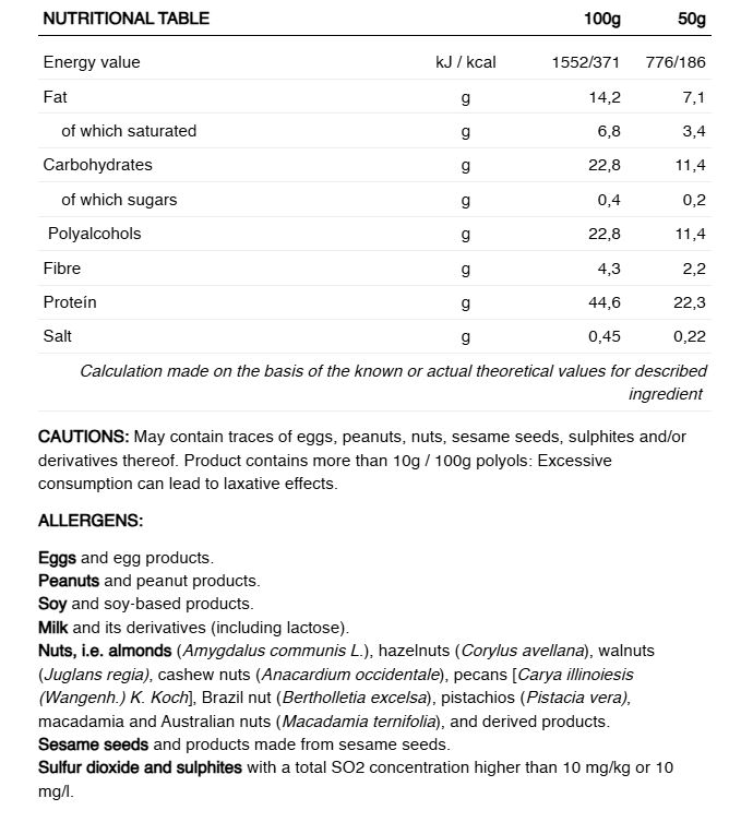INGREDIENTE: Proteine din lapte (proteine din lapte, emulgator: lecitină (soia)), umectant: xilitol, înveliș de ciocolată neagră cu îndulcitor de cacao: minim 52% (îndulcitor: maltitol, masă de cacao, unt de cacao, emulgator: lecitine (soia), aromă) (18,5%), peptide de colagen bovin, sirop de peptide de colagen bovin (bovin peptide de colagen, apă, regulator de aciditate (acid citric), izolat proteic din soia, ulei de floarea soarelui, arome, pudră de cacao degresată, pepite de cacao soia, (izolat din proteine din soia, cacao, amidon de tapioca), sare de mare, emulgator: lecitine (soia) ).