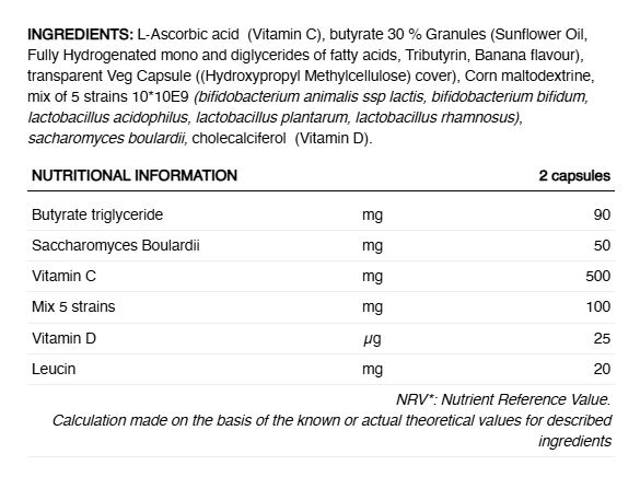 INGREDIENTE: Acid L-ascorbic (Vitamina C), butirat 30% granule (ulei de floarea soarelui, mono și digliceride complet hidrogenate ale acizilor grași, tributirină, aromă de banană), capsulă vegetală transparentă ((hidroxipropil metilceluloză) acoperire), maltodextrină de porumb, amestec de 5 tulpini 10*10E9 (bifidobacterium animalis ssp lactis, bifidobacterium bifidum, lactobacillus acidophilus, lactobacillus plantarum, lactobacillus rhamnosus), sacharomyces boulardii, colecalciferol (Vitamina D).