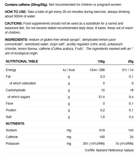 MOD DE UTILIZARE: Luați un tub de gel la fiecare 20-45 de minute în timpul exercițiilor fizice, bând întotdeauna aproximativ 300 ml de apă.