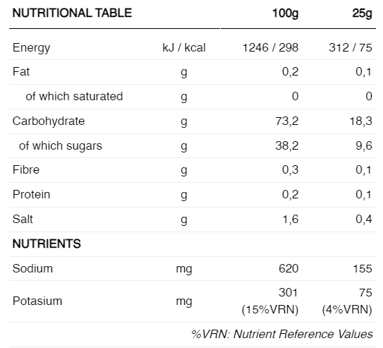 INGREDIENTE: Amestec de siropuri de grâu nerafinat fără gluten*, pudră de căpșuni* (căpșuni, maltodextrină) (3%), apă, sare de mare (clorură de sodiu), clorură de potasiu, aromă naturală de banane și căpșuni. Ingredientele marcate cu * sunt de origine ecologică.