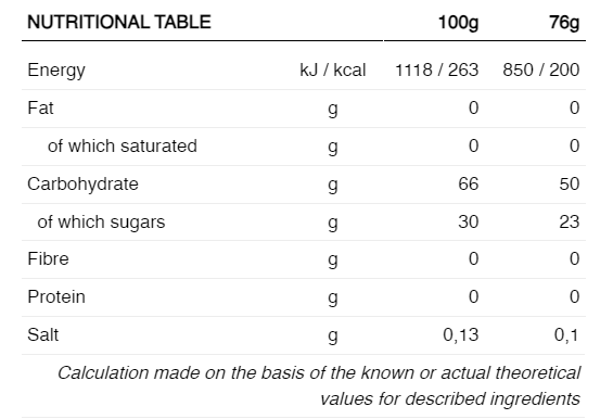 INGREDIENTE: Apă, maltodextrină (maltodextrină DE15, dextrină ciclică puternic ramificată* (cluster dextrin®), maltodextrină DE6), sirop de glucoză din porumb, zaharoză, aromă naturală, regulatori de aciditate (acid citric, citrat de sodiu), clorură de sodiu, agenți de gelificare (gumă gellan), conservanți (sorbat de potasiu).
