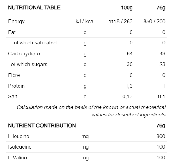 INGREDIENTE: Apă, maltodextrină (maltodextrină DE15, dextrină ciclică puternic ramificată* (cluster dextrin®), maltodextrină DE6), sirop de glucoză din porumb, zaharoză, BCAA-uri (L-leucină, izoleucină, L-valină), aromă naturală, regulatori de aciditate (acid citric, citrat de sodiu), clorură de sodiu, agenți gelifianți (gumă gellan), conservant (sorbat de potasiu), emulgator (lecitină de floarea soarelui).