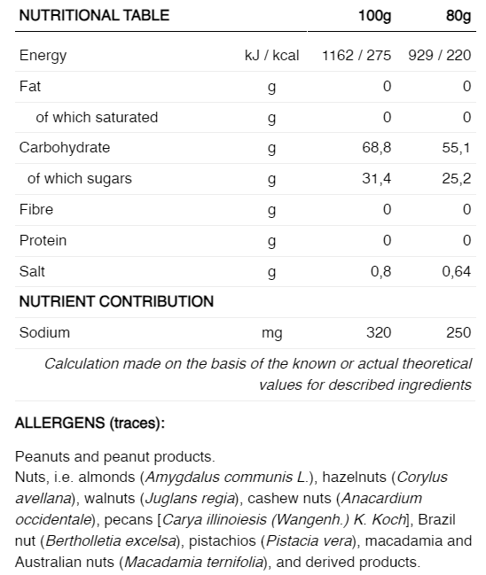 INGREDIENTE: Maltodextrină, fructoză, apă, sare, aromă de capsuni, regulator de aciditate (acid citric), conservant (sorbat de potasiu).