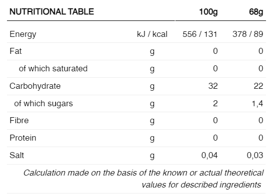 În format stick de 68 g, 89 kcal, conține 22 g de carbohidrați pe unitate, din care practic integralitatea sunt hidrați complecși și doar 1,4 g zahăr.