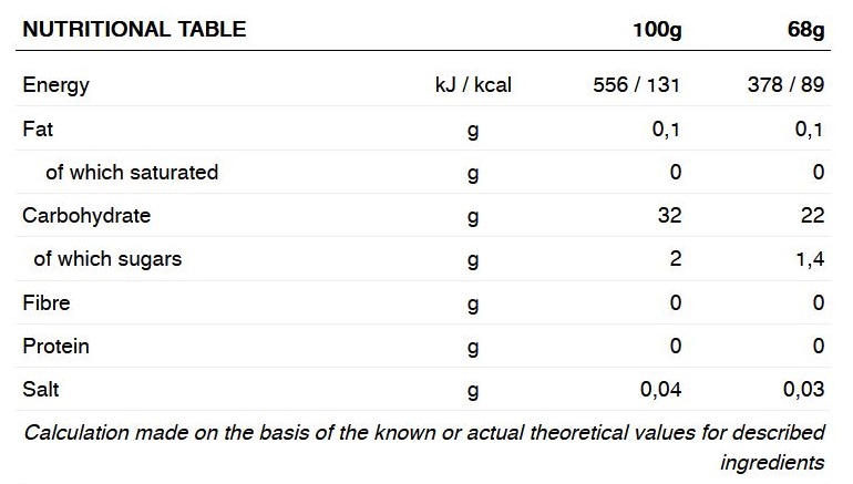 În format de baton de 68 g și 89 kcal, conține 22 g de carbohidrați pe unitate, dintre care practic integralitatea sunt hidrați complecși și doar 1,4 g zahăr.