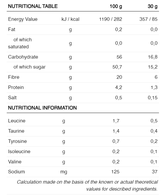 INGREDIENTE: zahăr auriu organic, sirop de orez organic, sirop de polidextroză, apă, agent de îngroșare: pectină [pectină, regulatori de aciditate: acid citric și polifosfat, maltodextrină], L-taurină, regulator de aciditate: acid citric, L-leucină, aminoacizi ramificati- lanț (Leu-Iso-Val), L-tirozină, aromă, colorant: beta-caroten [maltodextrină, beta-caroten, antioxidanți: palmitat de L-ascorbit și alfa-tocoferol, antiaglomerant: dioxid de siliciu], colorant: suc de pulbere concentrată de sfeclă roșie [suc concentrat de sfeclă roșie, maltodextrină, regulator de aciditate: acid citric], ulei de glazurare [ulei de cocos, agent de glazurare: ceară de carnauba), amidon de porumb.