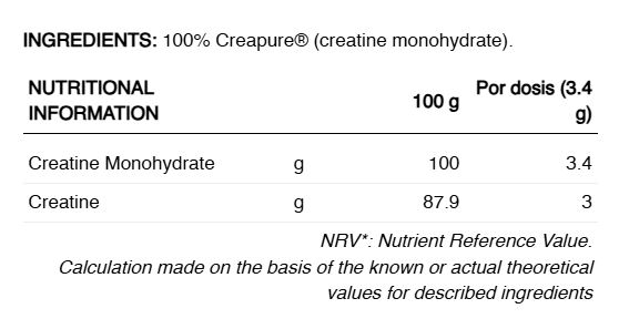 PRECAUȚII: Suplimentul alimentar nu trebuie utilizat ca substitut pentru o dietă variată și echilibrată și un stil de viață sănătos. Produsul este destinat numai adulților. A nu se utiliza în timpul sarcinii. Nu depășiți doza zilnică recomandată indicată. A nu se lăsa la îndemâna copiilor mici. Doza zilnică recomandată: 3g. Cantitatea de creatină monohidrat per 3 grame: 3 grame.