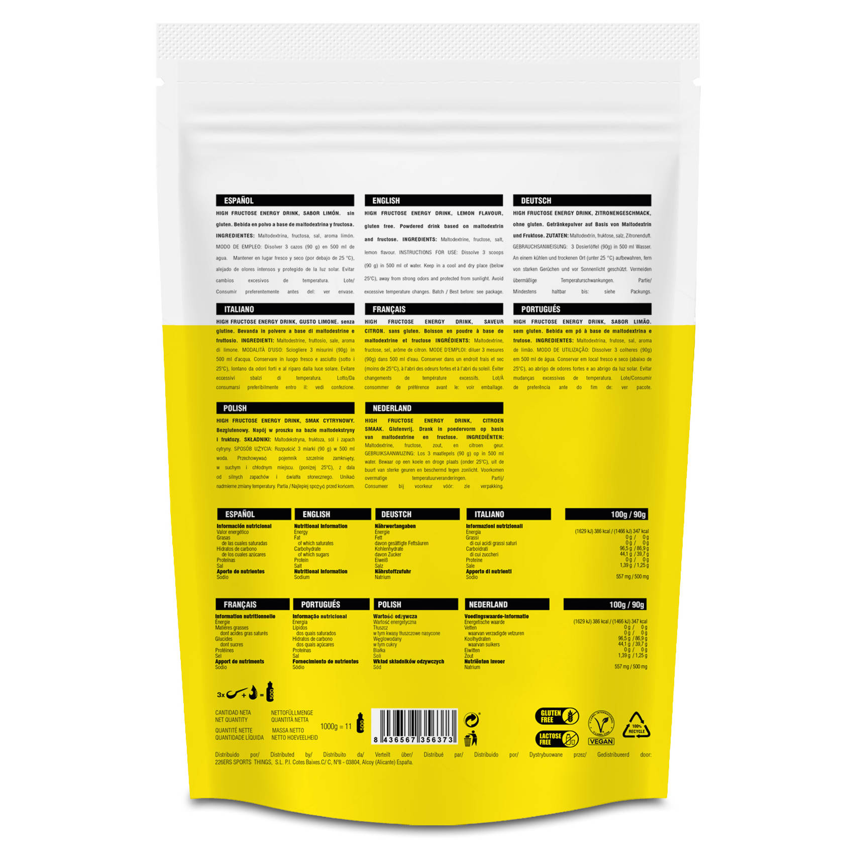HIGH FRUCTOSE ENERGY DRINK este o băutură sportivă formulată cu maltodextrină și fructoză în proporție de 10:8, furnizând 87 g de carbohidrați per porție și 347 Kcal. Pe lângă 500 mg de sodiu. Este vegan prietenos, fără gluten și disponibil în trei arome.