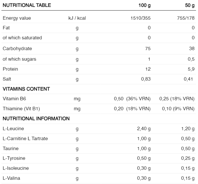 - TAURINA + L-CARNITINA: Taurina are proprietati antioxidante si antiinflamatorii si creste oxidarea grasimilor ca substrat energetic, care, impreuna cu carnitina pentru imbunatatirea transportului lor in mitocondrii, favorizeaza utilizarea grasimilor mentinend rezervele de glicogen, care este esențiale în sporturile de lungă durată. Ajută la îmbunătățirea sănătății generale, acționând în sinergie cu ceilalți nutrienți.