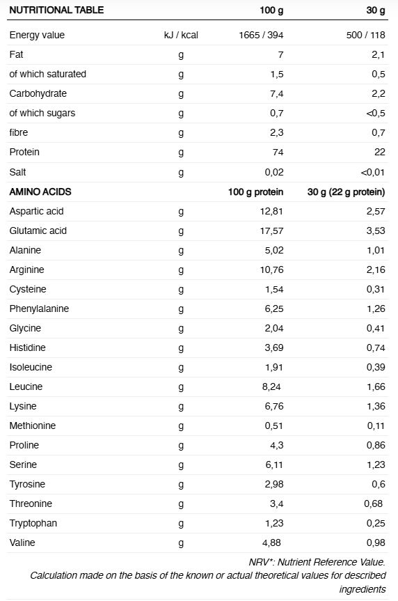 Produsul este potrivit pentru vegani, conținând 70% proteine și oferind 21 g de proteine per doză. Are puțin mai mult de 100 kcal, fiind săracă în grăsimi și fără adaos de zahăr, deoarece este îndulcită cu ștevie. Conținutul total de zahăr pe doză este mai mic de 0,5 g, deci este ideal pentru a bea în orice moment al zilei și pentru a crește sănătos aportul de proteine vegetale.