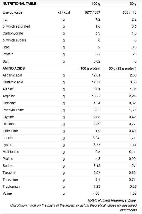 Produsul este potrivit pentru vegani, conținând 70% proteine și oferind 21 g de proteine per doză. Are puțin mai mult de 100 kcal, fiind săracă în grăsimi și fără adaos de zahăr, deoarece este îndulcită cu ștevie. Conținutul total de zahăr pe doză este mai mic de 0,5 g, deci este ideal pentru a bea în orice moment al zilei și pentru a crește sănătos aportul de proteine vegetale.