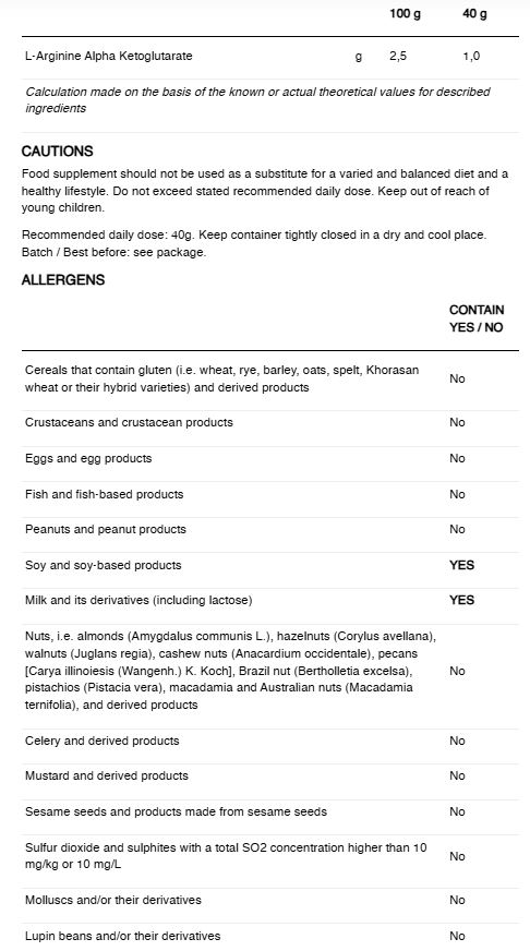 Suplimentat cu 1 g de Arginine AKG per porție. Arginina este un aminoacid care acționează ca un precursor de oxid nitric prin acțiunea enzimei oxid nitric sintaza (NOS); producția mai mare de oxid nitric a fost legată de îmbunătățirea performanței fizice prin potențiale efecte asupra funcției endoteliale, creșterea capacității aerobe și anaerobe, a forței, a rezistenței sau a puterii.