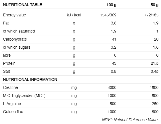 INGREDIENTE: concentrat proteic din zer (lapte, lecitină de soia), amidon de cartofi, creatină monohidrat, aromă, pudră MCT (trigliceride cu lanț mediu), semințe de in (Linum usitatissimum, semințe), L-Arginina AKG, agenți de îngroșare (gumă guar și gumă xantan). ), clorură de sodiu, îndulcitor (sucraloză).