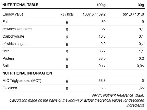 Fără gluten și fără adaos de zaharuri, deoarece doar eritritol și ștevia au fost folosite ca îndulcitori. Acestea nu ridică glicemia și nivelul insulinei, favorizând consumul de grăsimi pentru obținerea energiei.