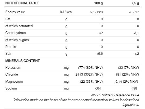 INGREDIENTE: Amidon de cartofi, citrat de sodiu, acid (acid citric), arome, citrat de potasiu, sare de mare (clorură de sodiu), îndulcitor (glicozide steviol), sare de magneziu a acidului citric și colorant (albastru strălucitor FCF).