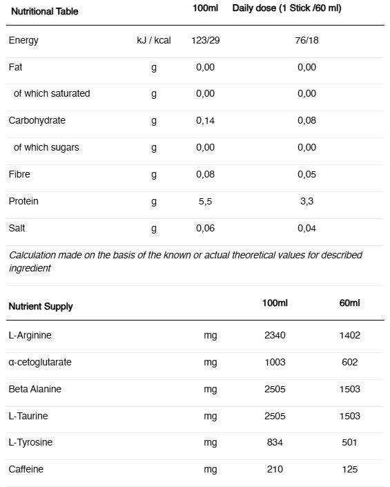 INGREDIENTE: Apa, L-Arginina Alfa Ketoglutarat, beta-alanina, taurina, acid (acid citric), l-tirozina, cofeina, aroma naturala, conservanți (sorbat de potasiu, benzoat de sodiu), agent de ingrosare (guma xantan), îndulcitori (sucraloza, Glicozide steviol din ștevia), colorant (caramel natural).