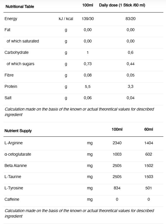 INGREDIENTE: Apa, L-Arginina Alfa Ketoglutarat, beta-alanina, taurina, acid (acid citric), l-tirozina, cofeina, aroma naturala, conservanți (sorbat de potasiu, benzoat de sodiu), agent de îngroșare (guma xantan), îndulcitori (sucraloza, Glicozide steviol din ștevia), colorant (caramel natural).