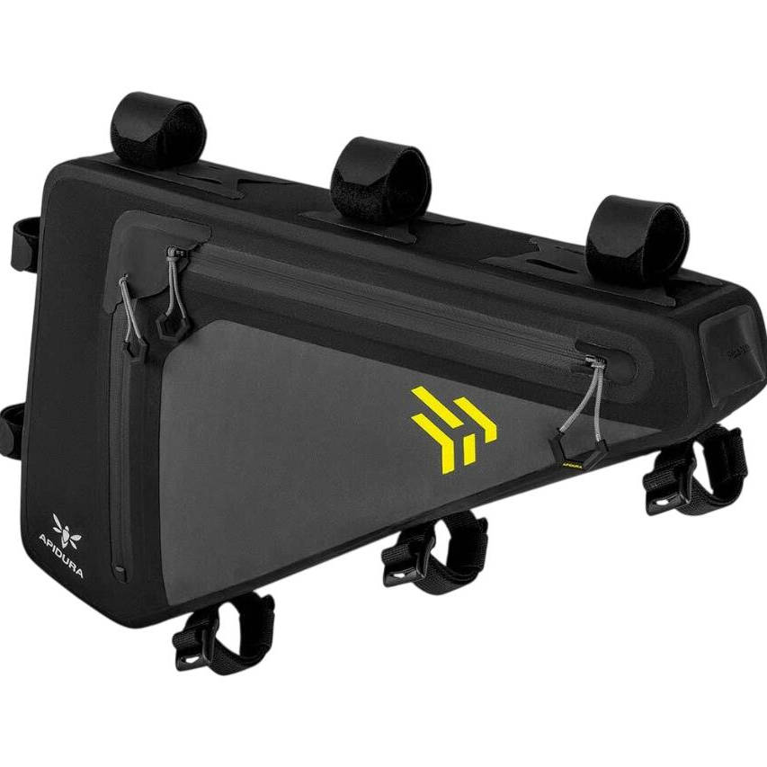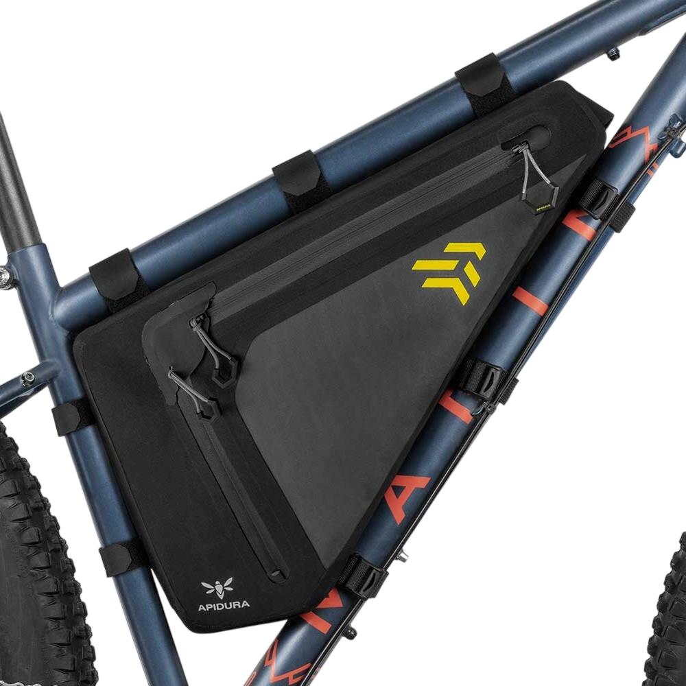 Cu o structură întărită și curele interne pentru fixarea conținutului, geanta cu cadru complet este suficient de versatilă pentru a umple în întregime triunghiul principal sau pentru a lăsa suficient spațiu pentru o cușcă de sticle pe tubul scaunului. Pachetul are o deschidere cu fermoar dublu care permite accesul ușor și vizibilitatea completă a conținutului, păstrând în același timp capacitatea de a deschide doar fermoarul superior pentru un acces ușor în timpul călăriei.