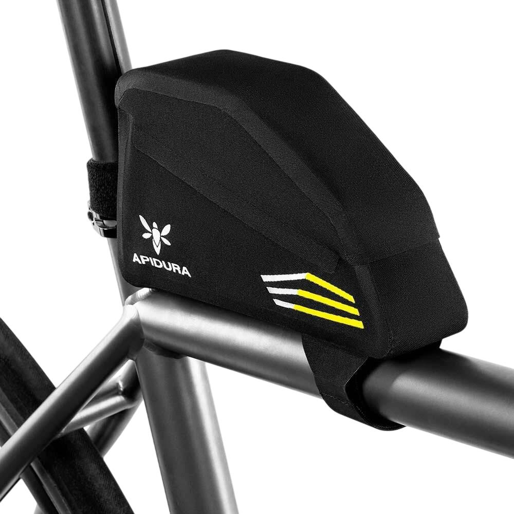 Pachetul Racing Top Tube este fabricat din Hexalon, o țesătură laminată la comandă dezvoltată special pentru Apidura. Conceput pentru a se potrivi cerințelor competiției de ultra distanță și audax, materialul este impermeabil și ușor, cu rezistență puternică la rupere și abraziune.