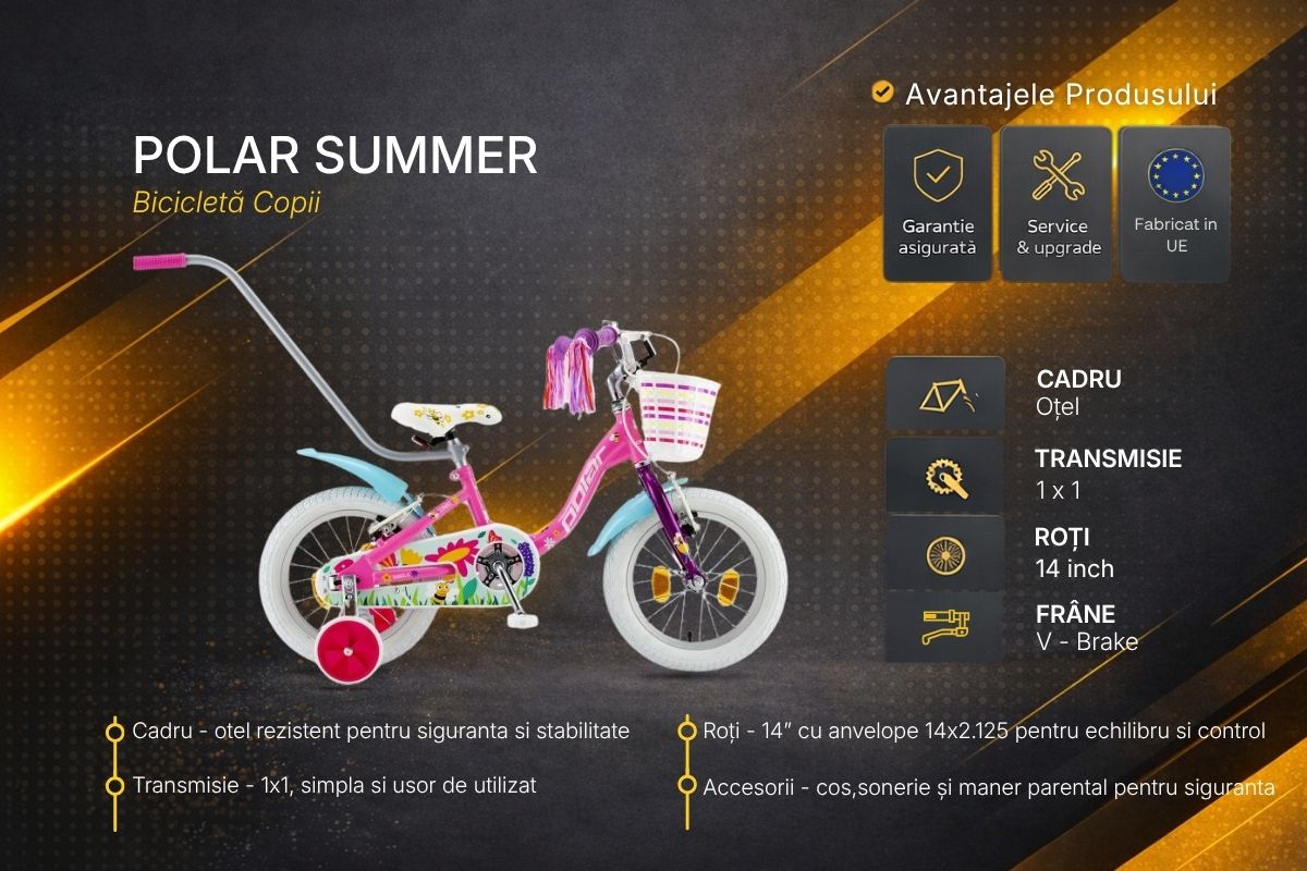 Bicicleta Copii Polar Summer 14 Inch este partenerul perfect pentru primele aventuri pe doua roti. Sigura, stabila si complet echipata, aceasta bicicleta ajuta la dezvoltarea echilibrului si coordonarii, oferind in acelasi timp distractie si incredere la fiecare plimbare.
