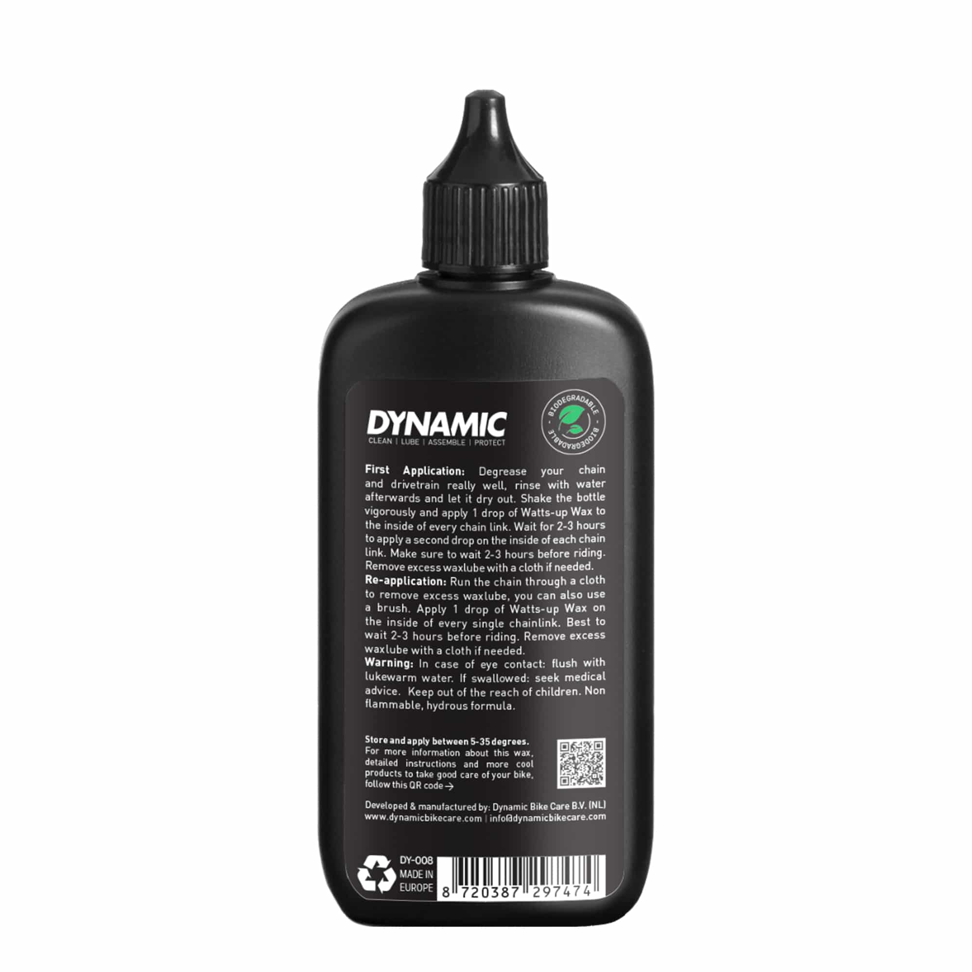 First Application: Degrease your chain and drivetrain really well, rinse with water afterwards and let it dry out. Shake the bottle vigorously and apply 1 drop of Watts-up Wax to the inside and outside of every chain link. Make sure to wait 2-3 hours before riding for the best results. Remove excess wax lube with a cloth if needed.