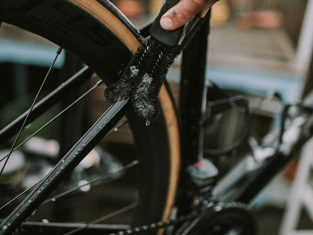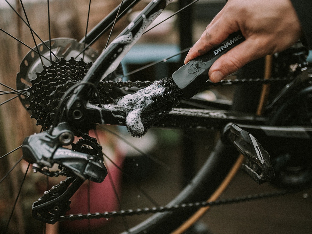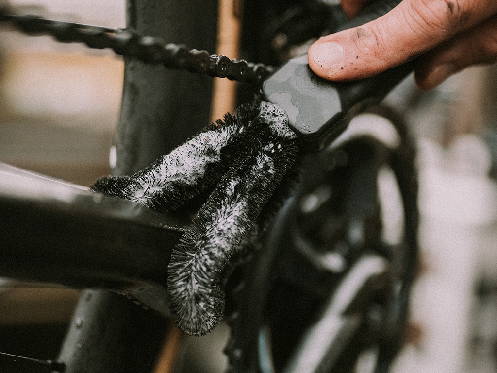 Pro tip: folositi peria Two prong brush cu Chain cleaner pentru a curata exteriorul lantului.