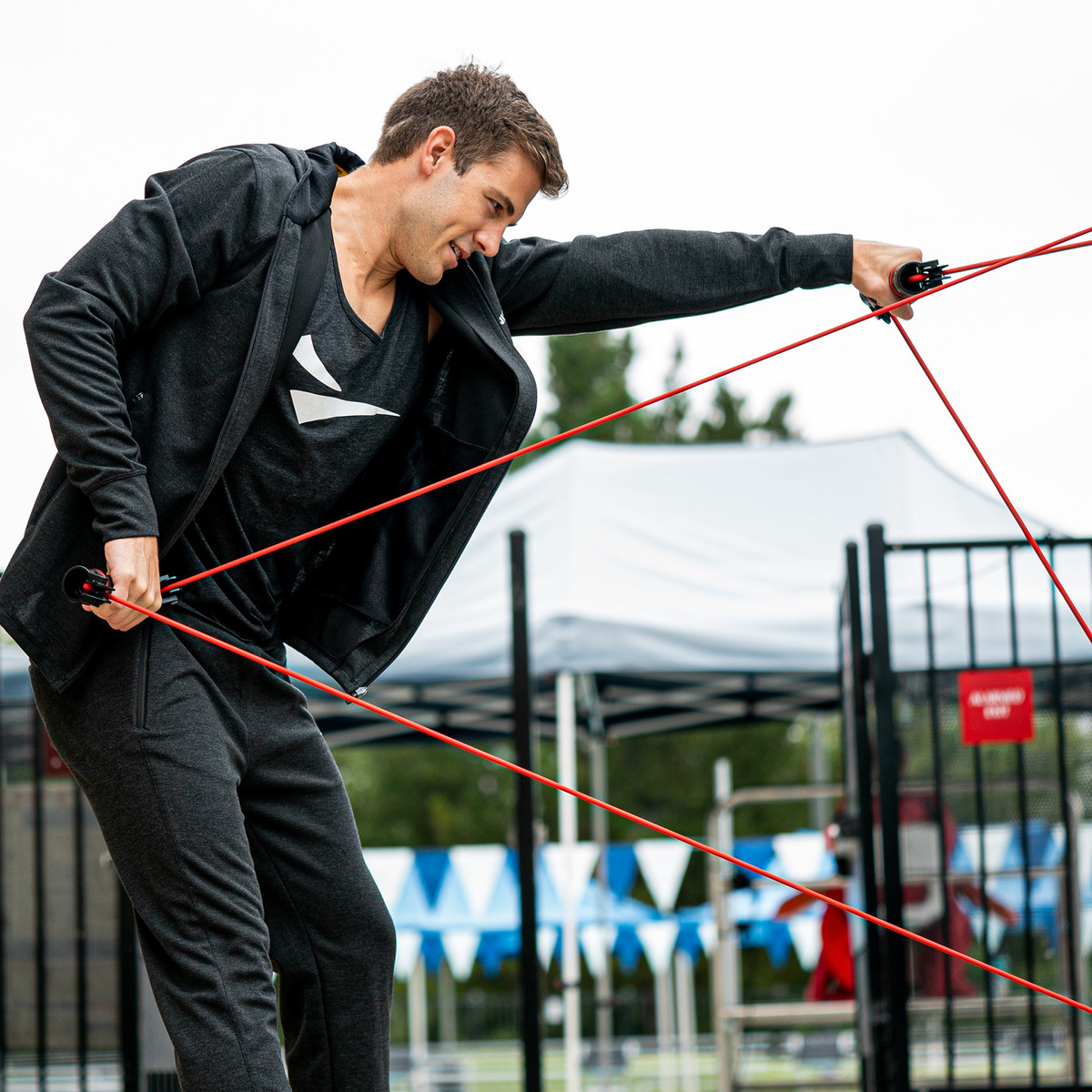 Atașați cablul la două puncte diferite pe un gard cu zale (sau similar) pentru a adăuga varietate și unghiuri diferite antrenamentului de forță și condiționare.