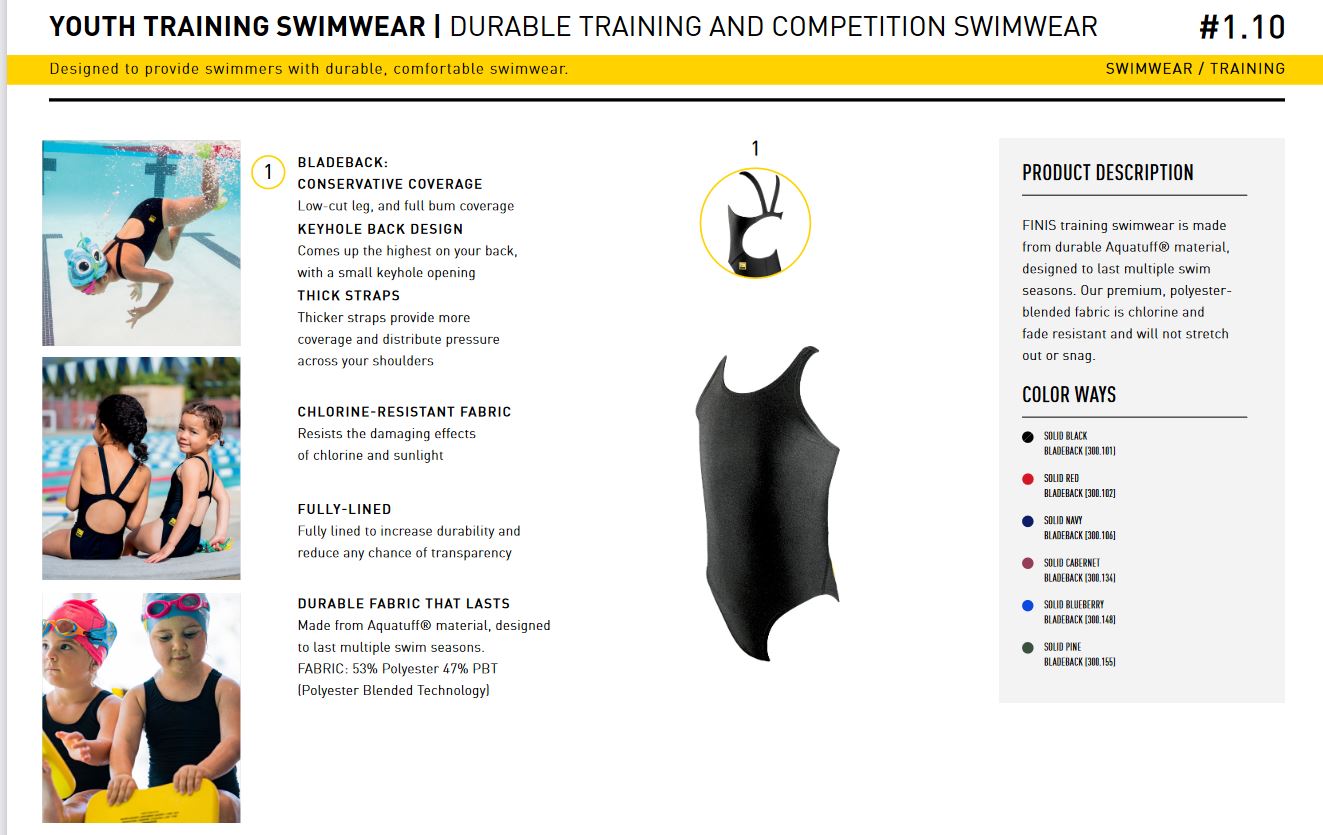 Costumele de inot FINIS sunt realizate dintr-un material rezistent conform tehnologiei Aquatuff®, ce asigura o rezistenta sporita pentru mai multe sezoane de inot. Tesatura premium utilizata, obtinuta din amestecuri de poliester, este rezistenta la clor și la decolorare si in plus nu se va intinde.