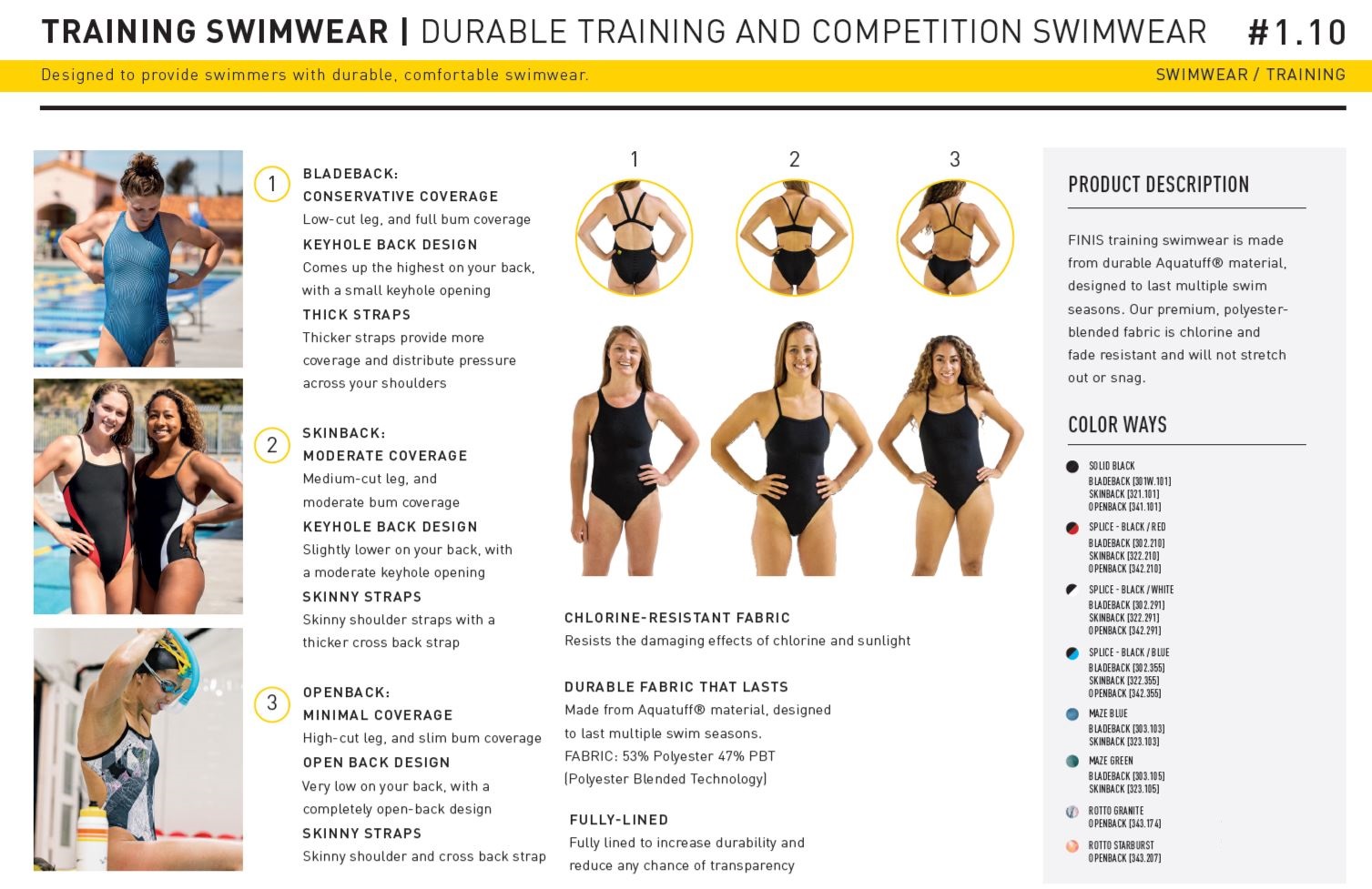 Costumele de baie de antrenament FINIS sunt fabricate din material durabil Aquatuff®, conceput pentru a rezista mai multor sezoane de înot. Țesătura noastră premium, amestecată cu poliester, este rezistentă la clor și la decolorare și nu se va întinde și nu se agăța.