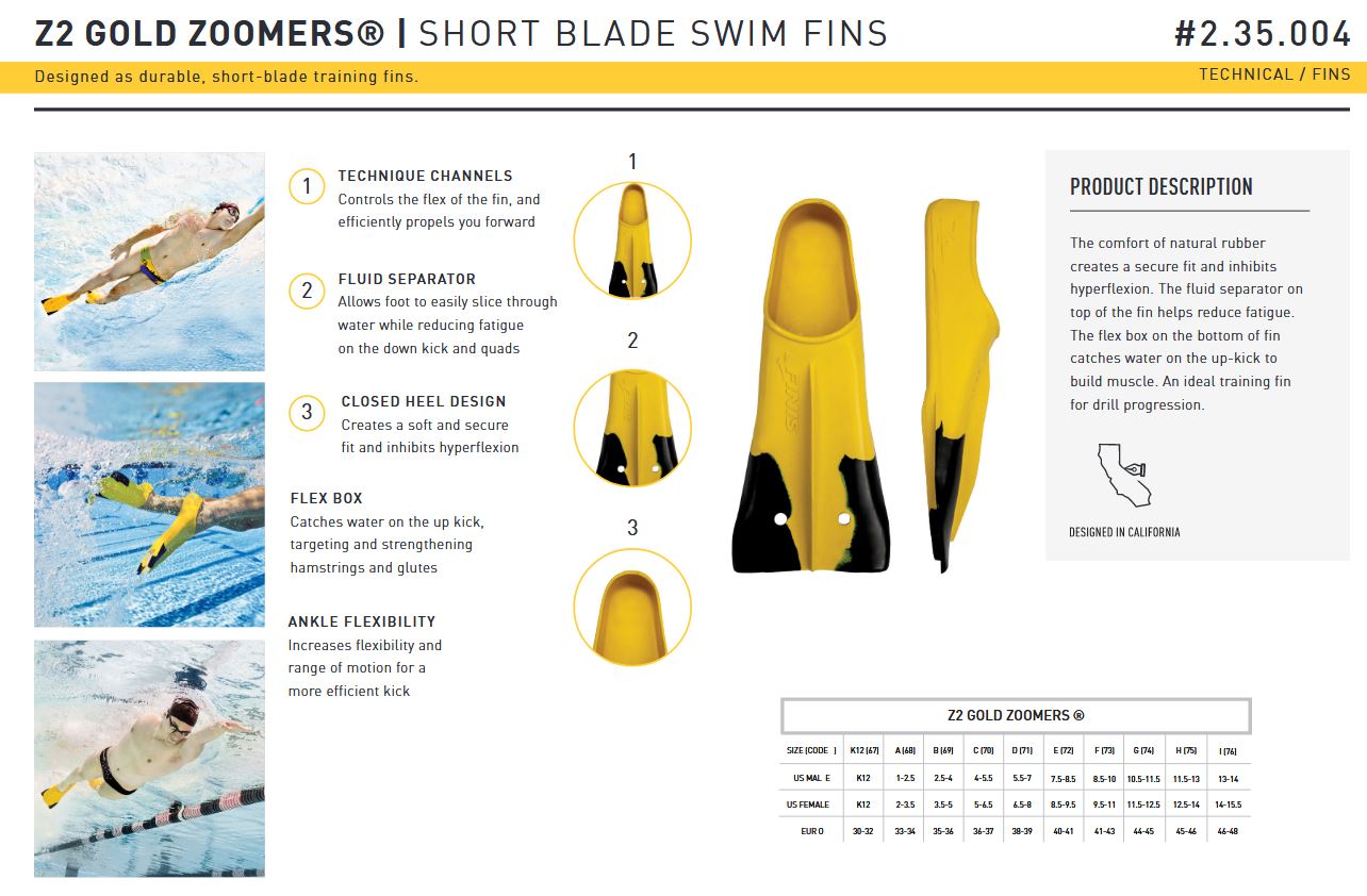 Cu lama sa scurtă, aripioarele Z2 Gold Zoomers® încurajează lovituri mai scurte și mai rapide în timp ce experimentează propulsia prin apă. Potrivirea confortabilă a cauciucului natural creează o potrivire moale și sigură și inhibă hiperflexia.