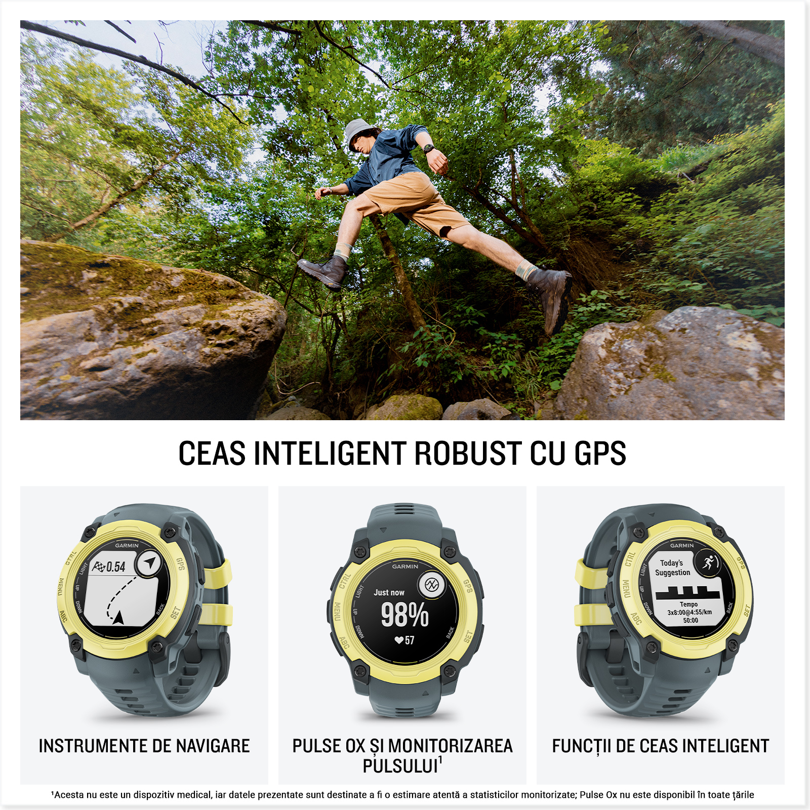 Instinct E este un ceas inteligent cu GPS, cu un design robust și funcțiile esențiale de care ai nevoie pentru a face față zilei.