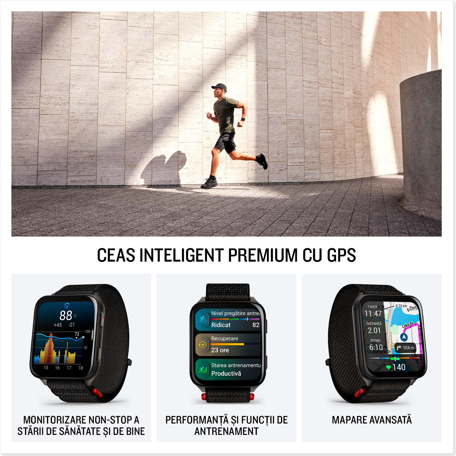 | Autonomie | Până la 8 zile (mod smartwatch); până la 20 ore (mod GPS cu muzică); mod economisire energie disponibil |