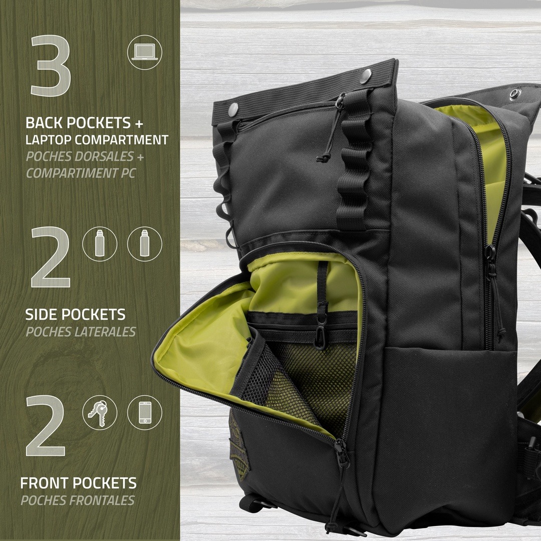 Două buzunare laterale cu nasturi pot transporta sticle și alte obiecte. Curelele inferioare permit compresia completă sau transportul ușor a obiectelor cu diametru mare (ex: covoraș, trepied, frânghie).
