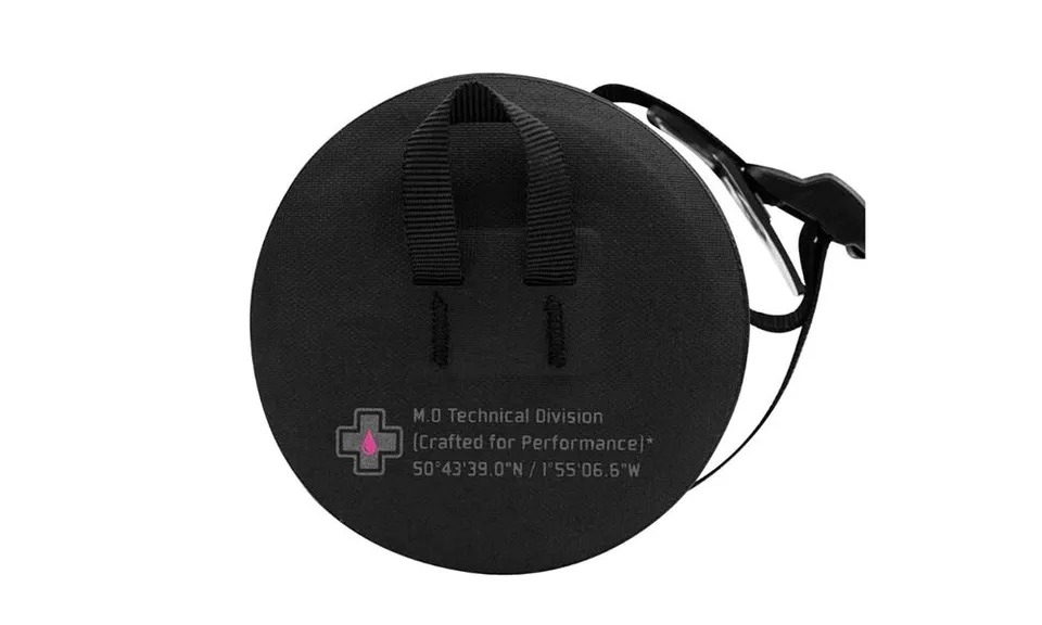 Vine cu 4 distanțiere din spumă, o curea de umăr și 2 cleme pentru atașarea unei huse Muc-Off Essentials.