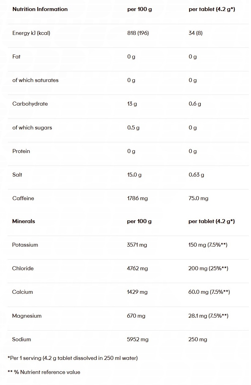 Max. 1 comprimat/zi. Pentru arome cu cofeina: contine cafeina (1 portie = 75 mg). Nu este recomandat copiilor sau femeilor însărcinate. Se dizolvă un comprimat în aproximativ 250 ml de apă. Acest supliment alimentar nu trebuie folosit ca înlocuitor al unei diete variate. O dietă echilibrată și un stil de viață sănătos sunt importante. Nu depășiți doza zilnică recomandată. A nu se lăsa la îndemâna copiilor mici.
