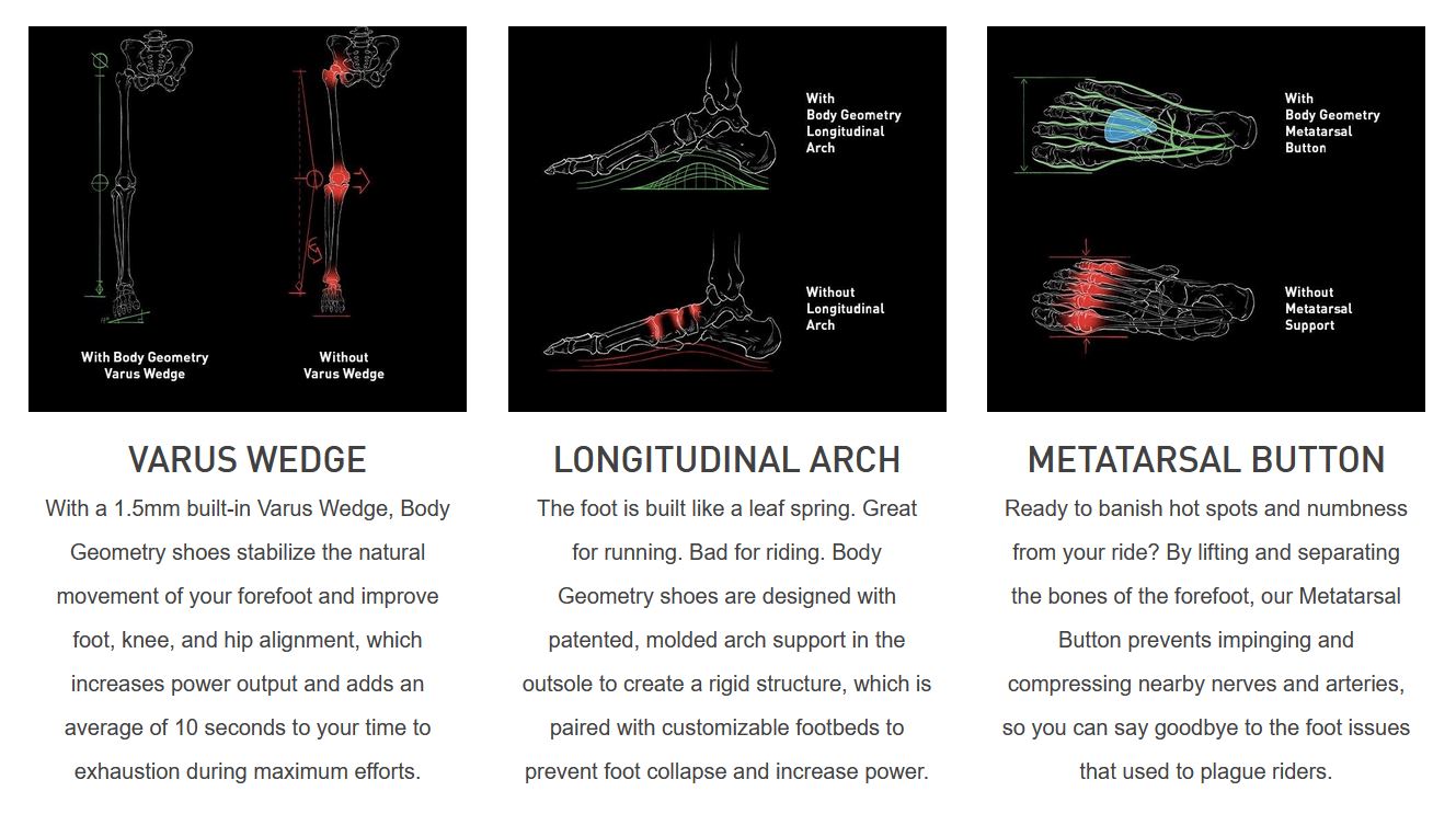Piciorul este construit ca un arc de frunze. Excelent pentru alergare. Rău pentru pedalat. Pantofii Body Geometry sunt proiectați cu suport patentat, modelat pentru arc în talpa exterioară pentru a crea o structură rigidă, care este asociată cu talpi personalizabile pentru a preveni prăbușirea piciorului și pentru a crește puterea.