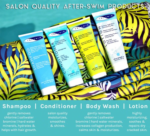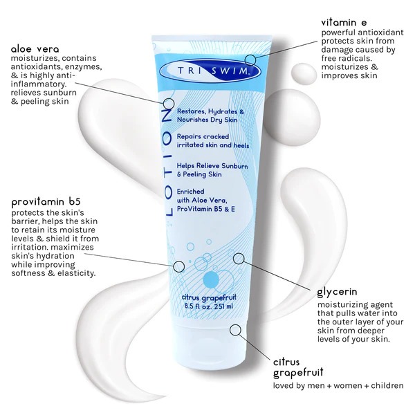 Loțiunea TriSwim este special formulată pentru a calma și vindeca pielea uscată, mâncărime și arsă de soare, plus pentru a elimina clorul, bromul, apa sărată și mirosul chimic.