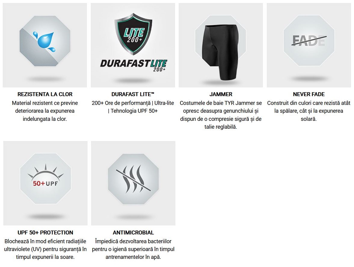 Toate costumele Durafast Lite® sunt rezistente la clor și susțin o performanță impresionantă de peste 200 de ore de utilizare.